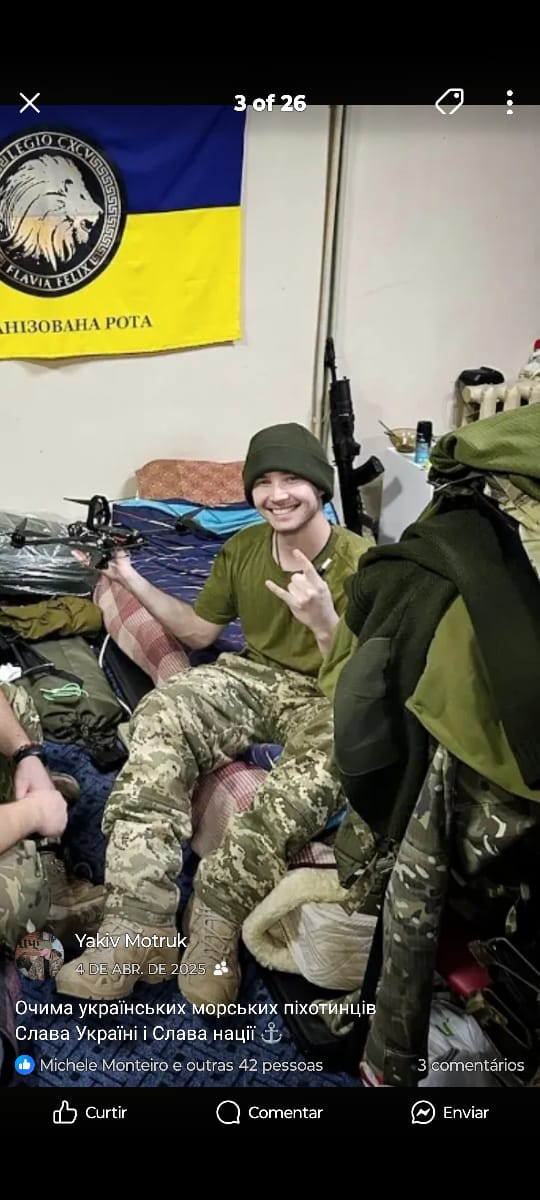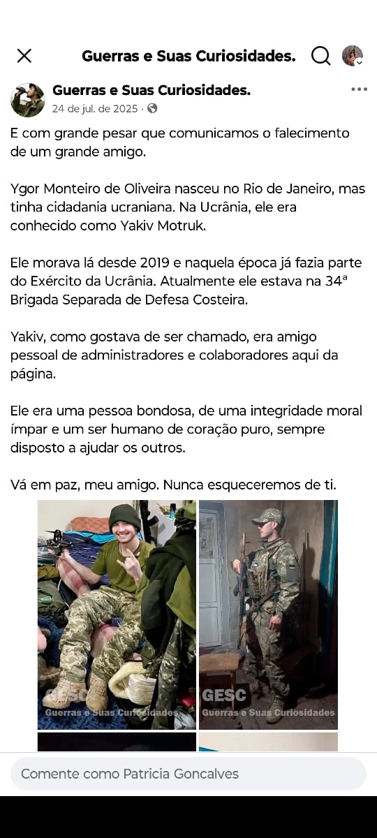 Ygor monteiro de Oliveira, _yakiv Motruk nome de guerra,data nascimento 13/11/1996 é data que ele faleceu 21/07/2025 tem nome do país, Alexandre Alves de Oliveira é Sandra rosa Fagundes monteiro ela e falecida como eu te passei,tem 4 irmãos Mateus, Marcelo, Alessandro , Michele, ele eram brasileiros do RJ de janeiro,ele falava três idiomas ,foi pra Ucrânia dia 22de setembro 2022 era uma pessoa extremamente inteligente e sempre buscava conhecimentos, menino muito bom, atuou na guerra da Ucrânia em númeras missões estava lá 3 anos é meses passou por alguns batalhão, sempre quando estava de férias estava no Rio de janeiro Brasil com a família,na última vez foi 05/06/2025 ,e quando tombou no dia 21de julho2025 em combate estava no batalhão 34 essa foi última missão,ele estava com3 saldado eram total 4com ele, ele já tinha passado o rio negro já tinha a cabado a missão quando foram surpreendido com drone está missão foi em kherson é uma cidade portuária no sul da Ucrânia localizado no mar negro, Ygor foi enterrado no dia 09 /09/2025 sepultamento cemitério n_Matviivske região Mykolai Ucrânia,numa cerimônia muito bonita com todas as homenagens que verdadeiro herói merece receber ele é um verdadeiro herói,ele era um menino muito desapegando as coisas materiais,ele vivia fervorosamente ele era muito verdadeiro, companheiro,, dedicado, inteligente, guerreiro, intenso, amigo um bom filho,que sua memória, possa sempre ser lembrada pós ele foi um herói de guerra, sempre buscou realizar os seus sonhos é tenho a certeza como pai amigo dele que morreu fazendo que gostava ajudando defendendo um povo injustamente atacado, lá morreram enfim,e lá ficaram a desejada pátria não retornaram Ygor já tinham a cidadania Ucraniana.